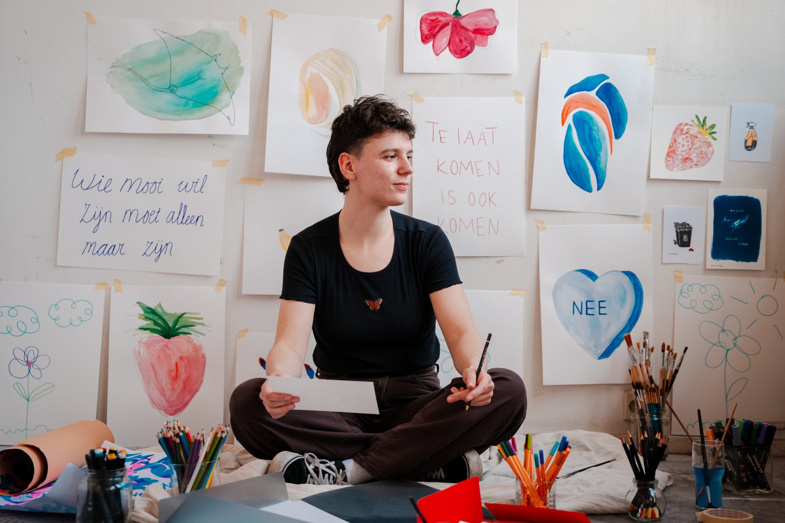 Sara lachend op de foto omringd door diens eigen werk. 1
