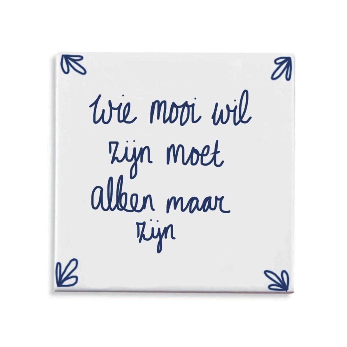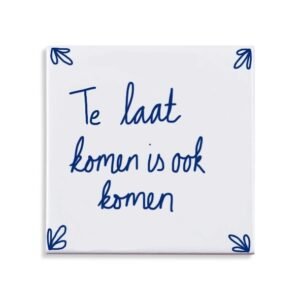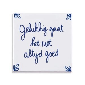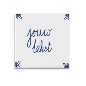 Handgeschreven teksten op tegeltjes. Het tegeltje is wit en beschreven met donkerblauwe tekst. De tegeltjes zijn 15×15 cm.